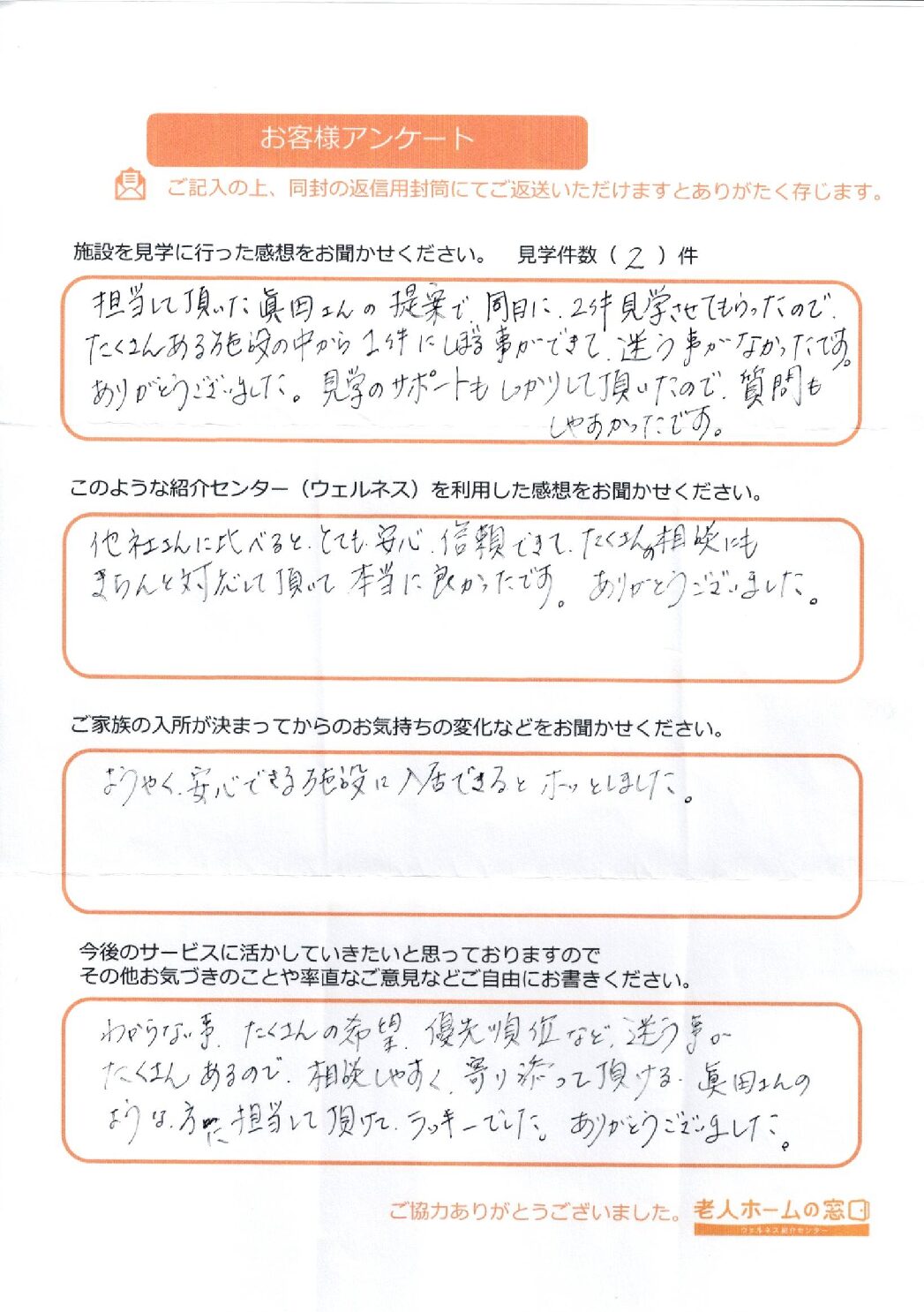 【施設を見学に行った感想をお聞かせください。】 担当して頂いた眞田さんの提案で、同日に、2件見学させてもらったので、 たくさんある施設の中から1件にしぼる事ができて、迷う事がなかっ...