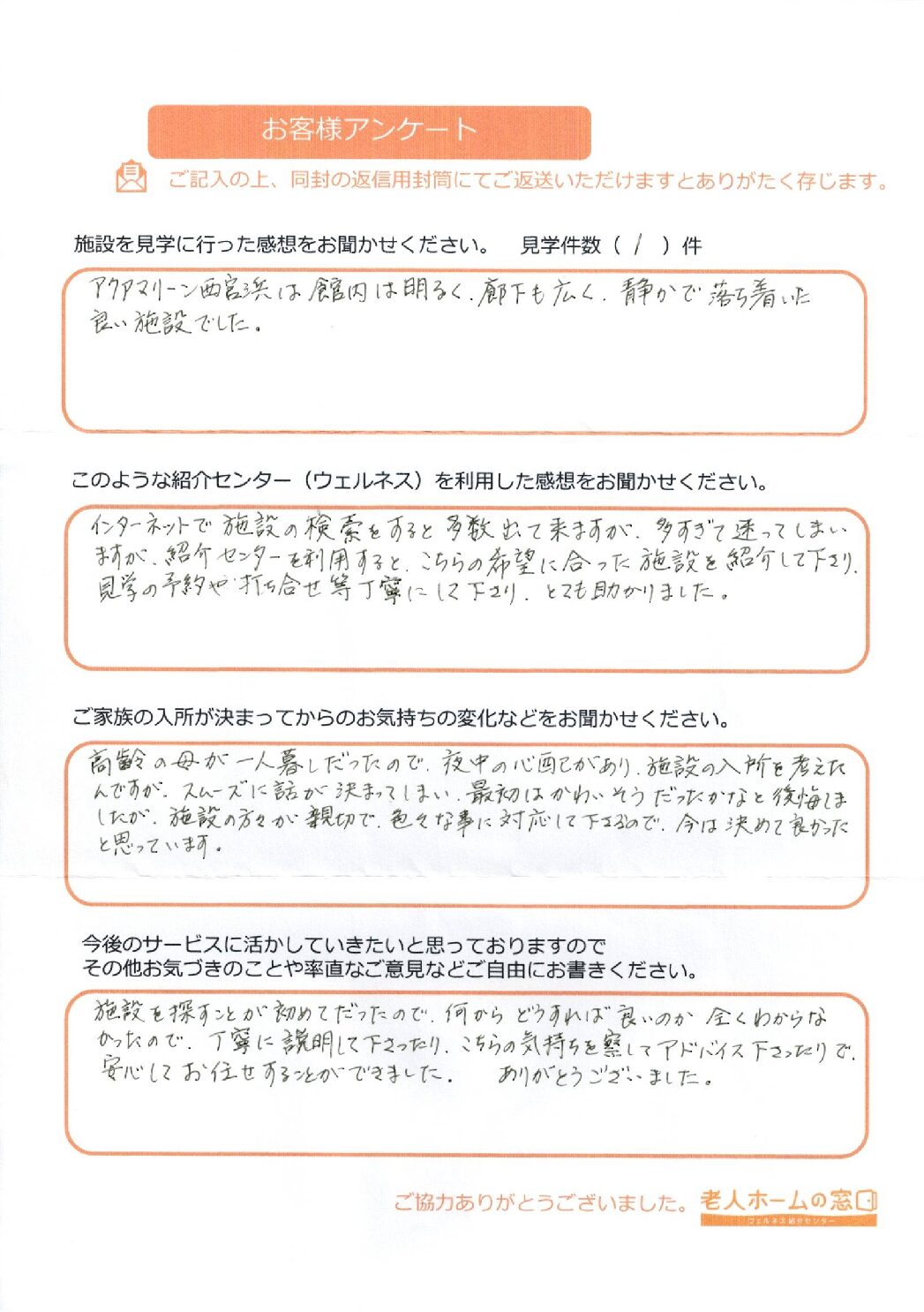 【施設を見学に行った感想をお聞かせください。】 老人ホームにいだいていたイメージとちがってとても明るい施設でした 【このような紹介センター (ウェルネス)を利用した感想をお聞かせく...